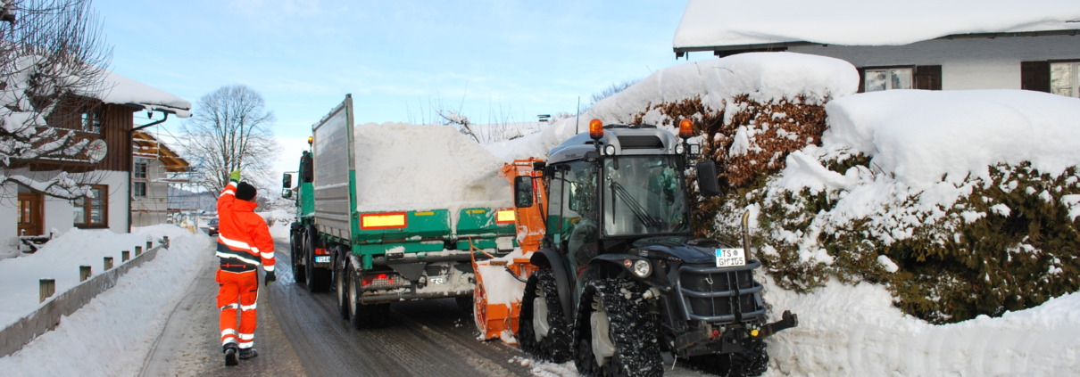 Der Winterdienst in der Gemeinde Marquartstein erfolgt nach einem festgelegten Räum- und Streuplan. Haben Sie bitte Verständnis dafür, dass bei starkem Schneefall nicht alle Straßen und verkehrswichtigen Gehwege bis 07:00 Uhr früh geräumt sein können. Das Räumpersonal nimmt je nach Witterung bereits ab 03:30 Uhr die Arbeit auf und versucht, den morgendlichen Räum- und Streudienst bis zum Beginn des Hauptberufsverkehrs abzuschließen. Während den Räumarbeiten ist es aus technischen Gründen unvermeidbar, dass sich am Straßenrand sowie an Grundstückszugängen bzw. Einfahrten Schnee ansammelt. Beschwerden hierzu müssen wir leider zurückweisen. Derartige Schneeansammlungen sind in eigener Zuständigkeit zu entfernen!