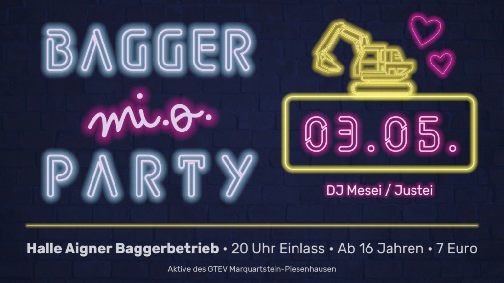 Die BAGGER MI O Hallenparty geht in die zweite Runde. Ab 20 Uhr in der Halle Aigner Baggerbetrieb.