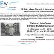 Sie haben Lust und Zeit, einen alleinlebenden oder auch kranken Menschen zu Hause oder im Heim zu besuchen? Um vorbereitet zu sein auf dieses Ehrenamt, wünschen Sie sich Rüstzeug und Hintergrundwissen? Mit unserem Einsteigerkurs machen Sie sich fit für den Besuchsdienst. Im Treffpunkt M von 16:00 – 20:00 Uhr. Anmeldung bei Barbara Burghartswieser Tel. 0160/1468077