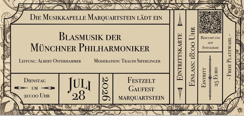 In traditioneller Blasmusikbesetzung präsentieren die Münchner Philharmoniker unter der Leitung des Dirigenten Albert Osterhammer ein Programm, das traditionelle und konzertante Blasmusik auf philharmonischem Niveau vereint – ein Muss für alle Blasmusikfans! Mit dabei: Traudi Siferlinger, bekannt als Moderatorin der „Wirtshausmusikanten“ im BR-Fernsehen, die mit charmantem Witz und unterhaltsamen Anekdoten durch den Abend führt. Karten gibt es bei Fachgeschäft Marquartstein – MAERZ & mehr, bei Café – Gelateria MARQUART, in den Tourist-Informationen im Achental oder online bei ticketscharf.de (zzgl. Gebühr)
