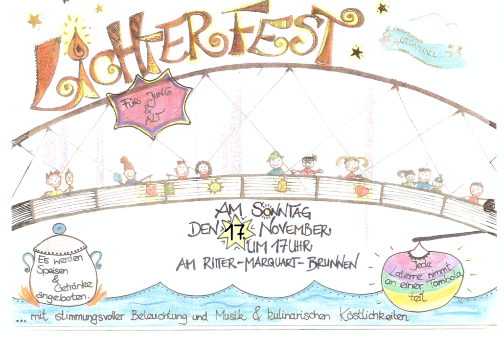 Herzliche Einladung zum Lichterfest für Jung & Alt in Marquartstein – mit stimmungsvoller Beleuchtung und Musik. Für das leibliche Wohl ist gesorgt. Treffpunkt ist um 17 Uhr am Ritter-Marquart-Brunnen. Jede Laterne nimmt an einer Tombola teil.