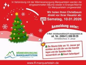 Auch 2026 startet die Jugendfeuerwehr das Jahr mit einer Christbaum-Sammelaktion. Gerne holen wir Ihren abgeschmückten Baum gegen eine kleine Spende bei Ihnen zu Hause ab. Anmeldung unter christbaumaktion@ff-marquartstein.de oder 0176 968 769 48