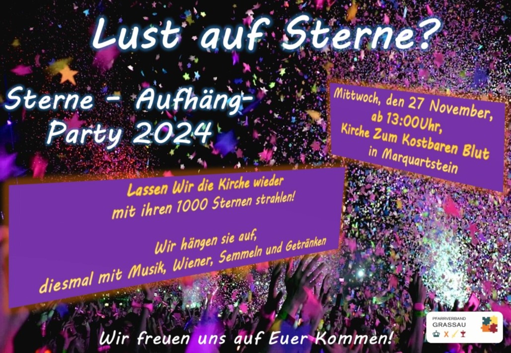 Lust auf Sterne? Lassen wir die Kirche wieder mit ihren 1000 Sternen strahlen! Wir hängen sie auf mit Musik, Wiener, Semmeln und Getränken. Wir freuen uns auf Euer Kommen!