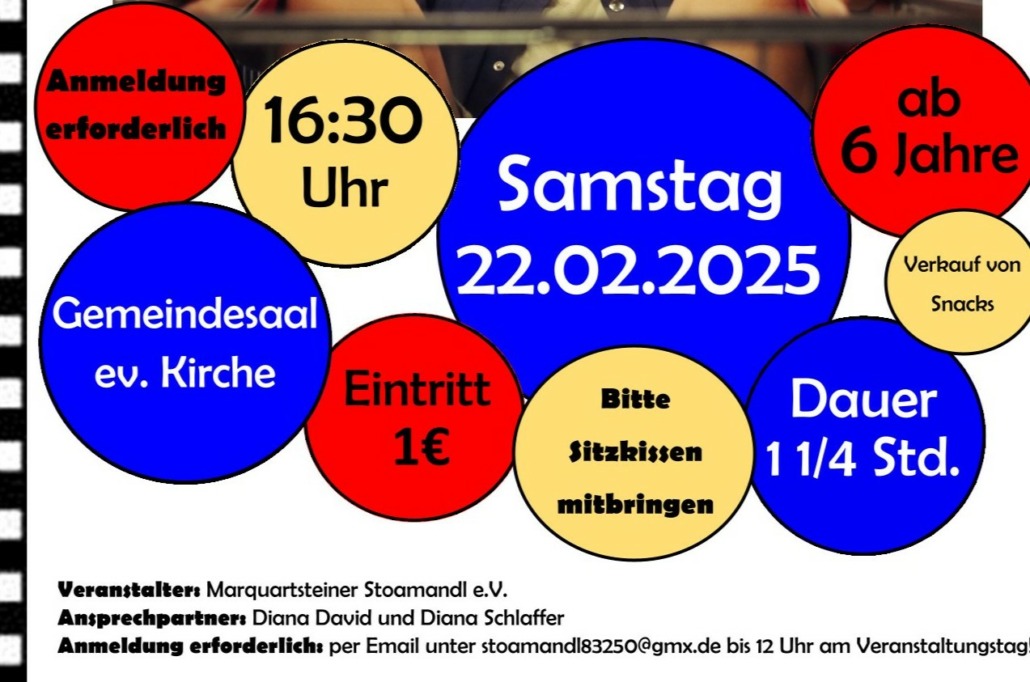 Verkauf von Snacks und Getränken, Eintritt 1 €. Anmeldung erforderlich bis 12 Uhr am Veranstaltungstag bei Diana David, Diana Schlaffer oder unter stoamandl83250@gmx.de. Wir freuen uns auf euch!