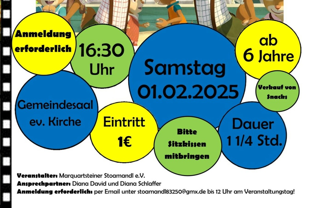 Herzlich Willkommen zum Stoamandl Kinderkino! Es gibt wieder einen spannenden Film für Kinder ab 6 Jahren, bei dem ihr viele Abenteuer miterlebt und so einiges über das Ausbildungscamp für Osterhasen erfahrt. Verkauf von Snacks und Getränken, Eintritt 1 €. Anmeldung erforderlich bis 12 Uhr am Veranstaltungstag bei Diana David, Diana Schlaffer oder unter stoamandl83250@gmx.de. Wir freuen uns auf euch!