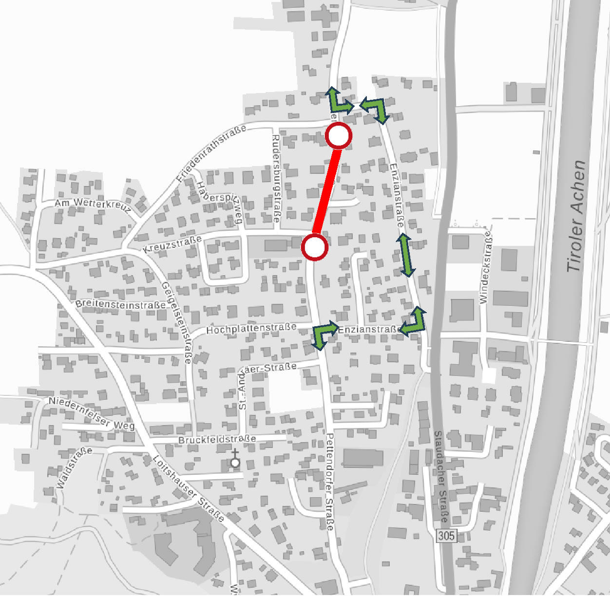 Nachdem die Verlegung der Fernwärmeleitungen im Kreuzungsbereich erfolgt ist, schließt sich der Weiterbau in Richtung Süden bis zur Einfahrt Kreuzstraße (Kindergarten) an. Ab diesem Zeitpunkt kann die Kreuzung Friedenrath-/Enzianstraße wieder für den Verkehr freigegeben werden. Die Umleitung der Pettendorfer Straße erfolgt dann über die Enzianstraße (siehe nachfolgendes Bild).